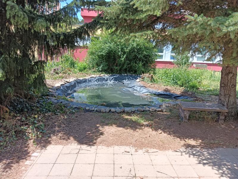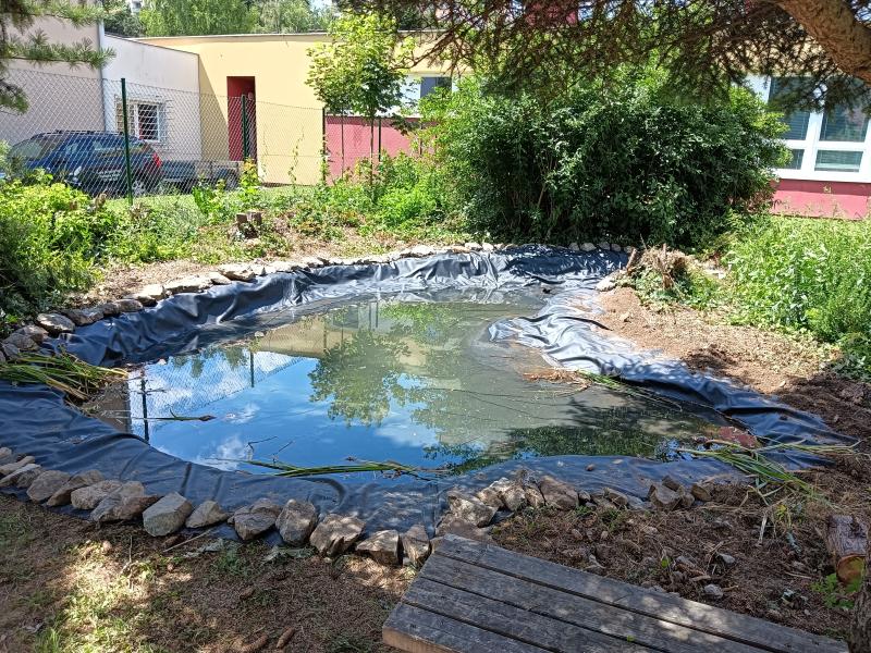 Následující podzim a konec léta byl projekt realizován a třída se rozhodla sama udělat všechny výkopové práce. Museli si sami sehnat potřebné nářadí - tímto děkujeme rodičům žáků, kteří nám zapůjčili materiál. Ke konci školního roku došlo potom k položení jezírkové fólie. Do jezírka budou ještě vysazeny rostliny, ale pro ně je potřeba nechat nějakou dobu odstát vodu.