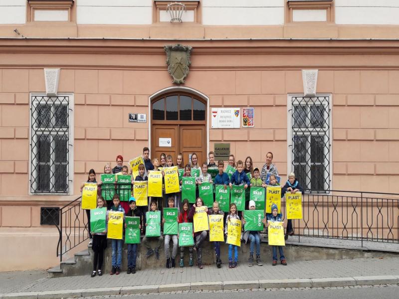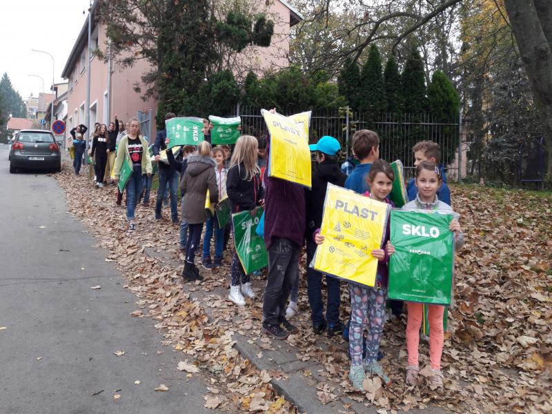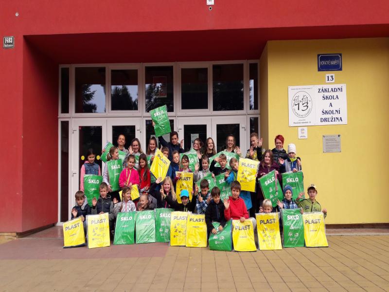 Po dvou týdnech spolupráce s paní učitelkou Irenou Procházkovou, koordinátorkou EVVO, jsme vypátrali, že nám může velmi pomoct Městský úřad v Řečkovicích, konkrétně oddělení životního prostředí. A tak se celá 3.A společně s velkými kamarády „deváťáky“ vydala na výpravu na MÚ, kde vyzvedla tašky se suchým zipem na třídění odpadu. Společně je pak roznosili do jednotlivých tříd po celé škole a všichni se radovali, že právě třídění skla, plastu, papíru i vybitých baterií může být nejen užitečné, ale i estetické.