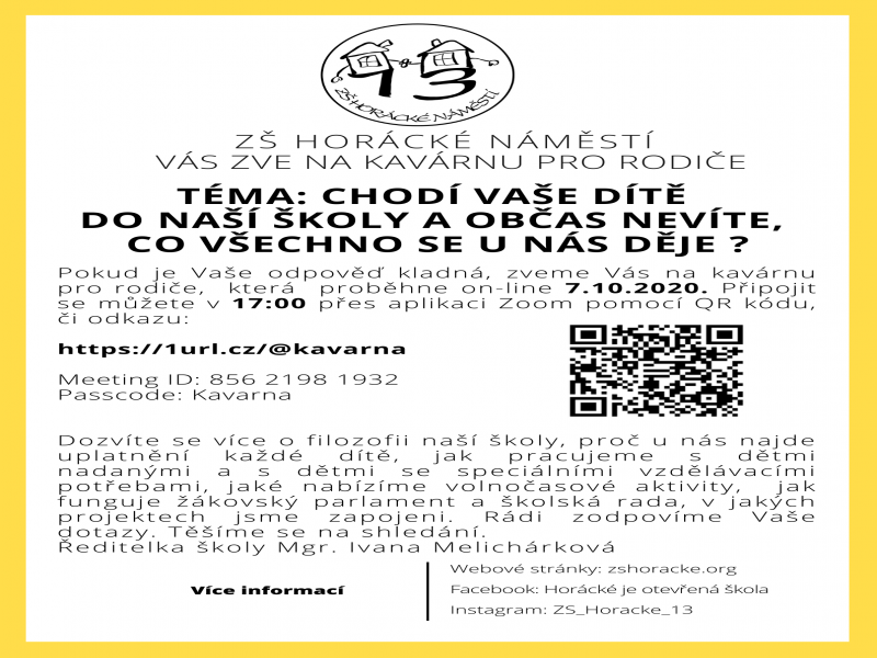 7. října 2020 jsme si pro Vás připravili r.ruzicka Út, 06.10.2020 - 13:28 Již 7. října 2020 jsme si pro Vás připravili další Kavárničku pro rodiče tentokrát o naší škole. Více informací naleznete v obrázku. Obrázek