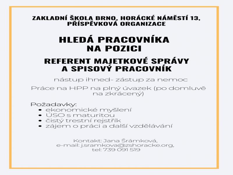 Základní škola Brno, Horácké náměstí 13, příspěvková organizace, hledá pracovníka na pozici