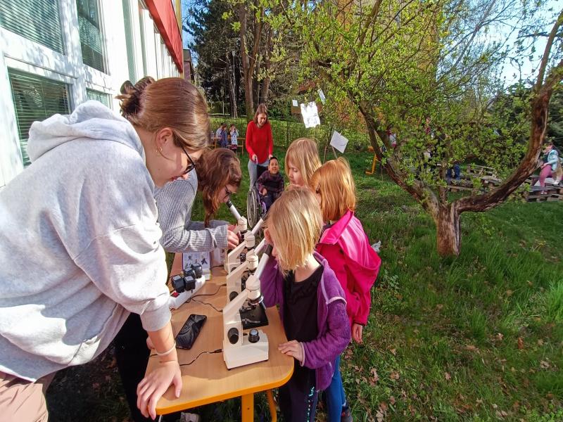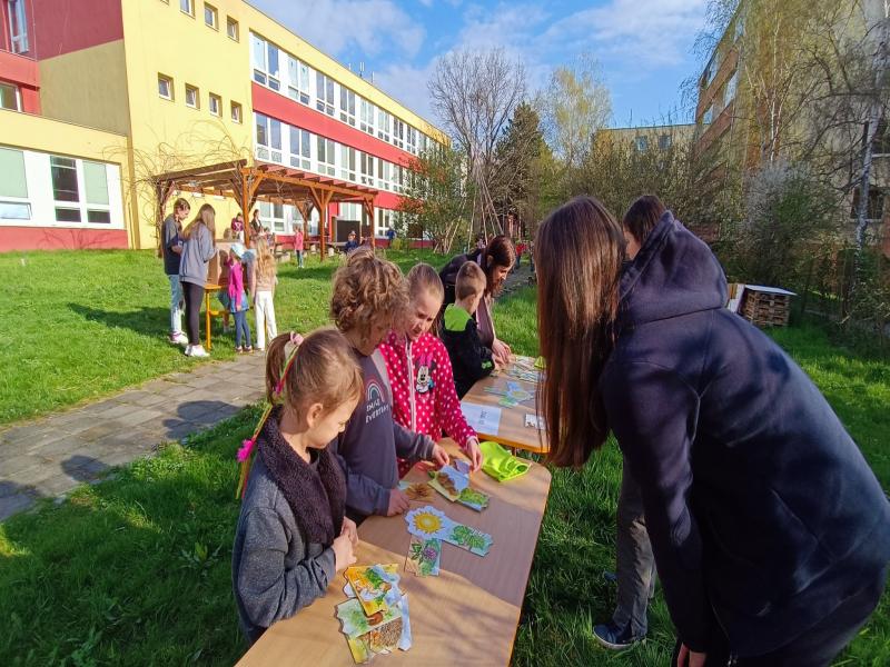 V pátek 21. dubna se na školní zahradě slavilo. Žáci 1. stupně měli možnost dozvědět se nové informace o kousku přírody, který nás obklopuje. Pro své mladší spolužáky si deváťáci nachystali stanoviště, na kterých si mohli vyzkoušet, jak je těžké být opylovačem na přírodní nebo na okrasné zahradě. Podívali se do našeho nového vermikompostéru a poznali jeho obyvatele z blízka. Ti, kteří měli dobré oči a uši, se seznámili s ptačími sousedy, kteří navštěvují krmítko a můžou je tam vidět. Poznáním a pochopením přírody jsme blíž k jejímu udržení a ochraně. 🍃